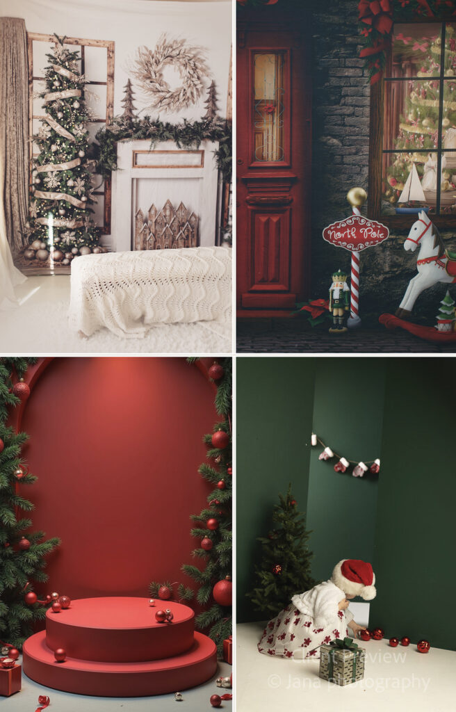 This setup was playful, festive, and full of holiday charm. The green background, paired with lots of red ornaments, created a joyful and energetic atmosphere. It was especially loved by families with young children, as it added a fun and lively holiday feel without overwhelming the image.